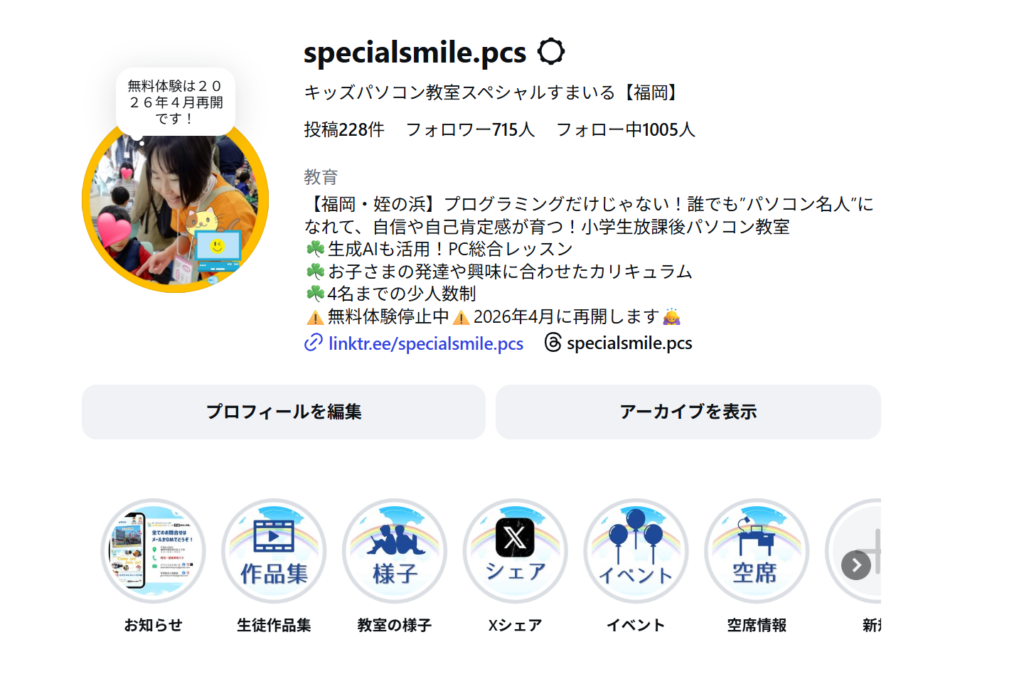 無料体験は2026年4月に再開します 2026年1月4日 最終更新日時 : 2026年1月4日 special-smile スペシャルすまいるは、2026年3月末に移転を予定しております。その関係で、無料体験レッスンは2026年4月まで停止させていただきます。移転先等の詳細については追ってご案内いたします。最新情報は、このホームページかInstagramの投稿をご覧くださいませ。 ※Instagramアカウントは下記画像をタップするとご覧いただけます。